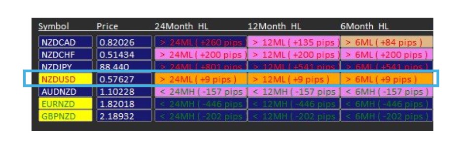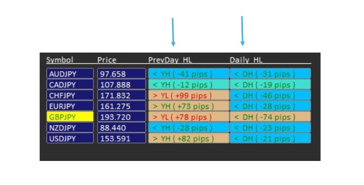 7. Next are the columns for showing the pip distance to the 24Month Highs and Lows, 12Month Highs and Lows, 6Month H/L, 3Month H/L, 2Month H/L, 1Month H/L, last week H/L, previous day H/L, and current day H/L.