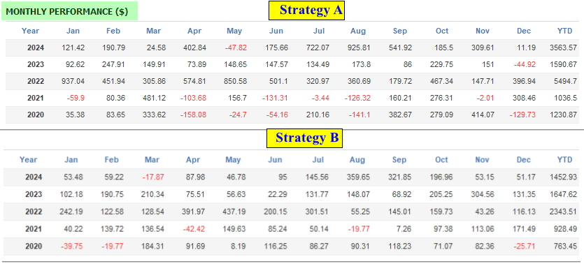 - Strategy A exhibits more negative monthly performances compared to Strategy B. However, both strategies demonstrate strong recovery and impressive performance in later years, particularly in 2022, 2023, and 2024, with consistent positive returns.