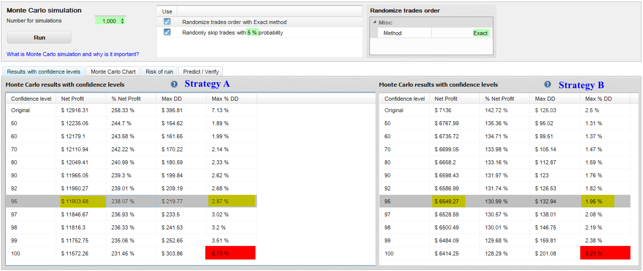 We will run a 1000 simulations using Exact randomization and 5% trades missed to determine more realistic drawdown and profit expectations.
