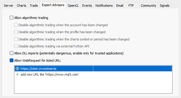 Add https://stein.investments to the list of allowed URLs in your Metatrader terminal properties. This quick step ensures uninterrupted data flow, keeping your charts live and accurate.