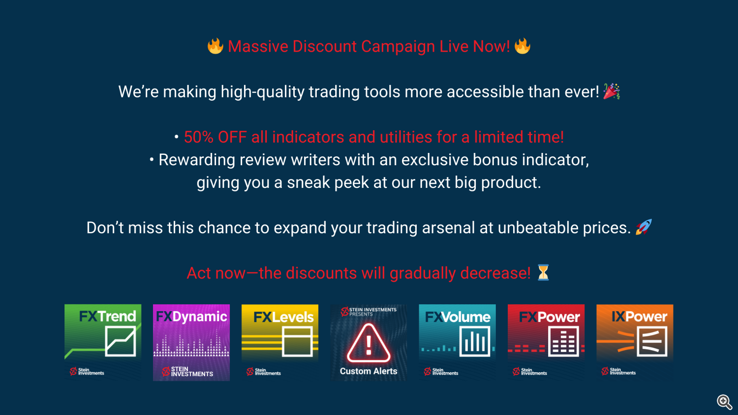 We understand that customers who recently purchased one of our products might feel frustrated about this. But think of it this way: now’s the perfect opportunity to expand your portfolio with minimal investment. Whether you’ve been eyeing another tool or want to explore a new aspect of trading, this is your moment to get more value than ever before!