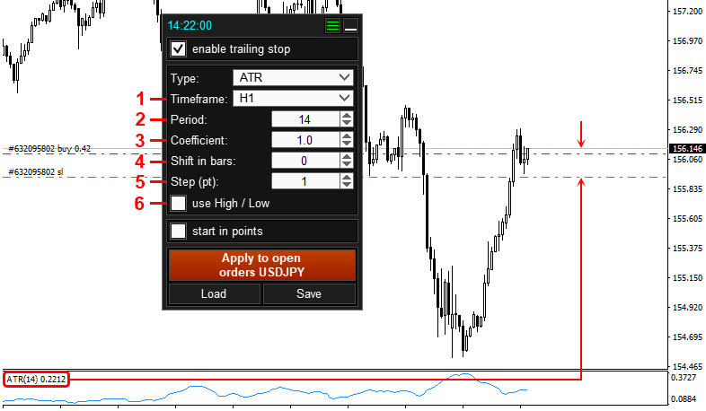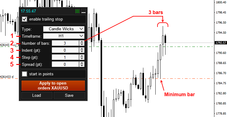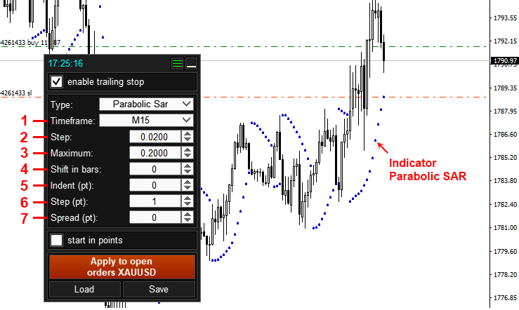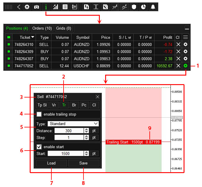 - After setting up the trailing stop, click the “Apply to open orders..” button 5. After clicking button 5, these Trailing Stop settings will be applied to all orders and positions that are open on the current symbol.