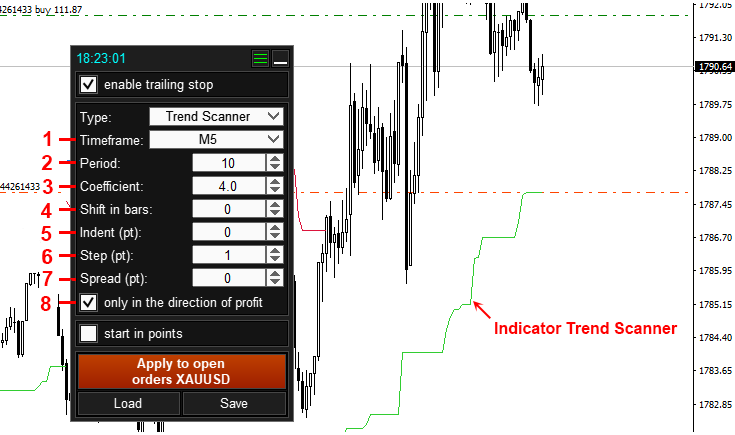 - Bar number for calculating a trailing stop using the Trend Scanner indicator (bars are numbered starting from zero and directed from right to left).