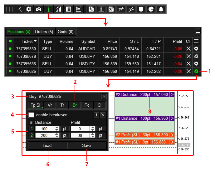 - After configuring the Partial Close function, click the “Apply to open orders..” button 5. After clicking the button 5, these Partial Close settings will be applied to all orders and positions that are open on the current symbol.