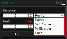 | Points | The distance is set in points. Point is the smallest possible price change on a symbol. The panel does not normalize points in any way (does not multiply them by 10, etc.) and applies points as is: