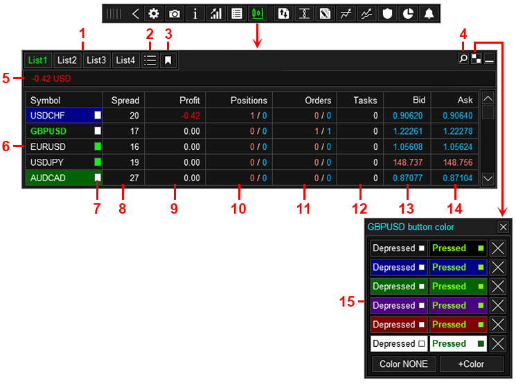 - Buttons for switching lists of symbols.