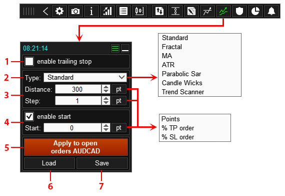 The Trailing Stop settings on this panel apply only to new orders and positions. To apply changes to the Trailing Stop settings on this panel to already open orders and positions, click button 5 (see below).