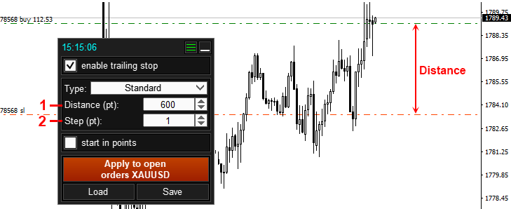 - Distance from the current price to the stop loss, with this distance the stop loss will follow the price.