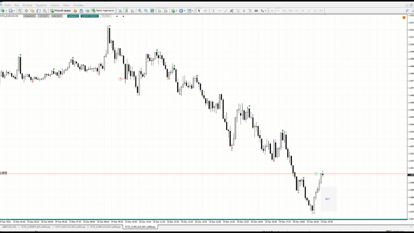 When the trend changes, the indicator automatically identifies the 65% rollback zone and displays it on the chart. This zone is key for identifying potential entry points.
