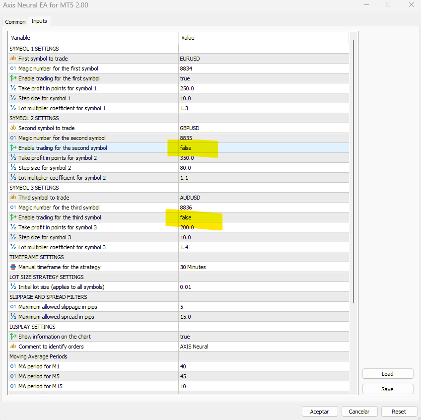What you will see: AXIS is loaded on EURUSD with the default settings but with GBPUSD disabled. We open the settings and disable the AUDUSD symbol, as this will now work in another instance.
