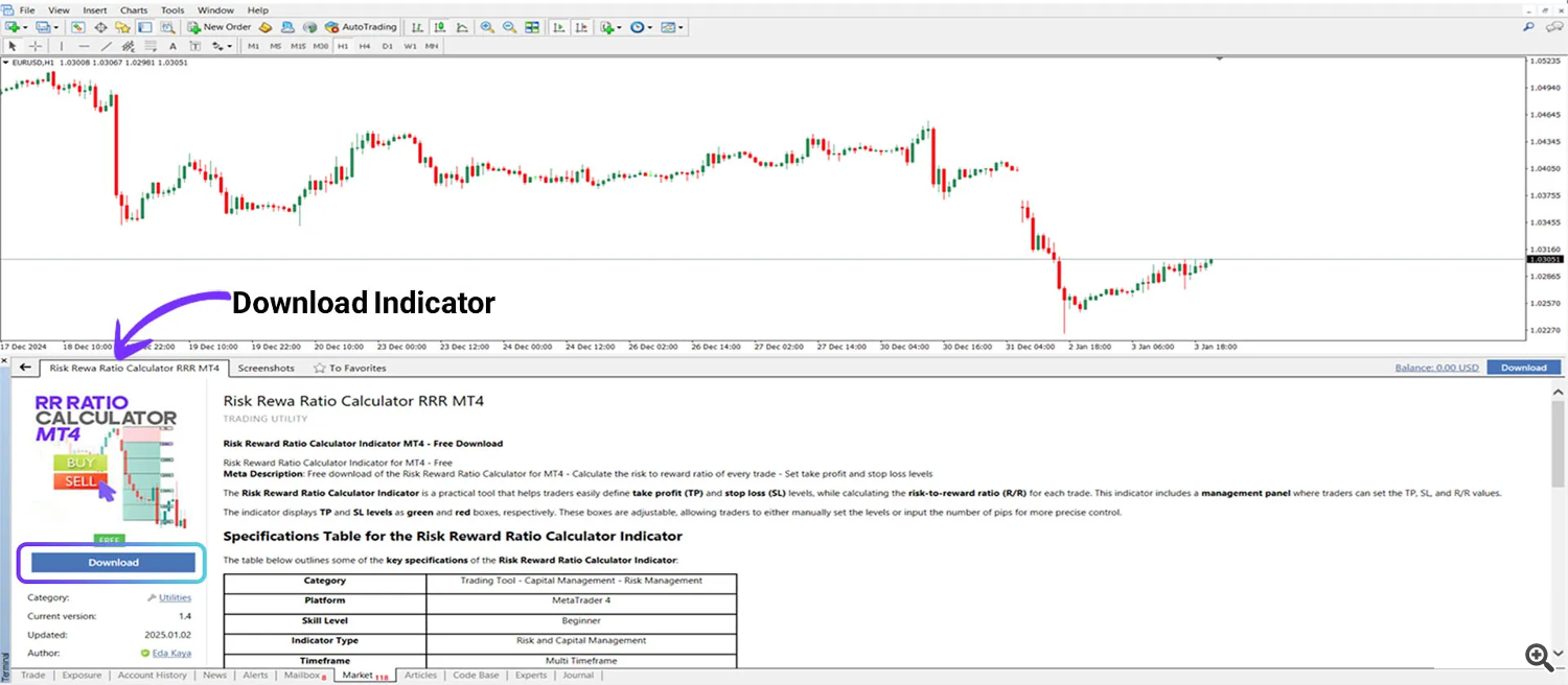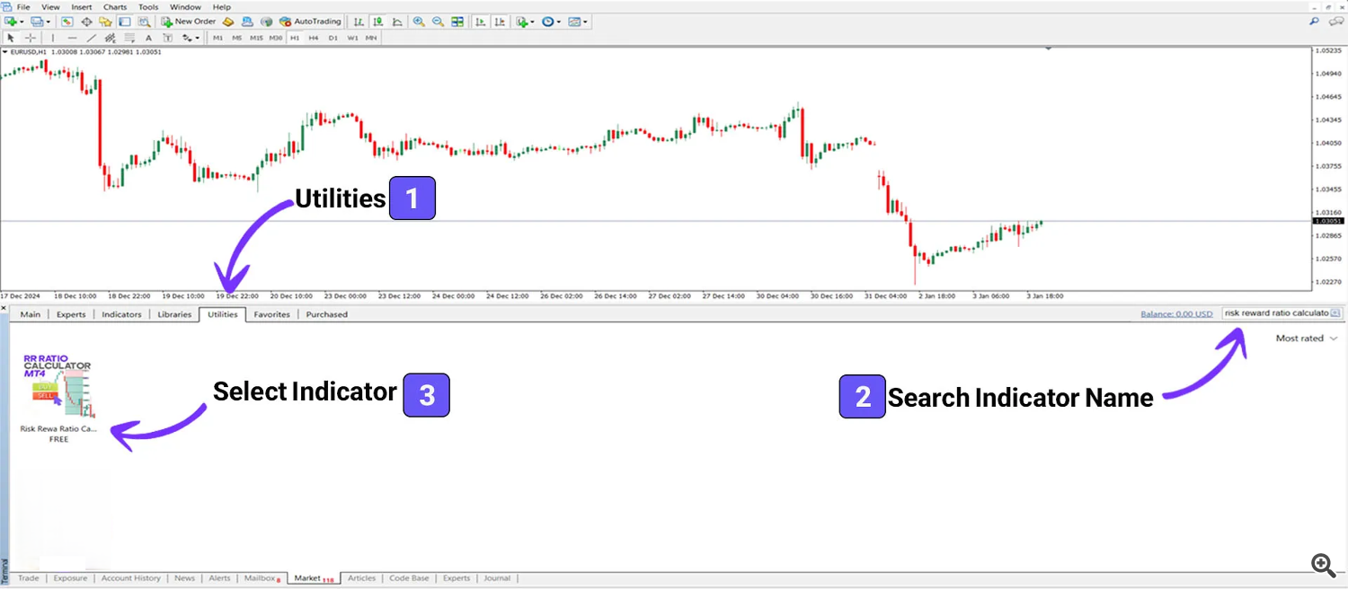 In the MQL5 Market panel, navigate to the “Utilities” section. Here, you can search for the desired indicator by entering its name in the “Search” box. Once you find the indicator, click on it to access its detailed information page.