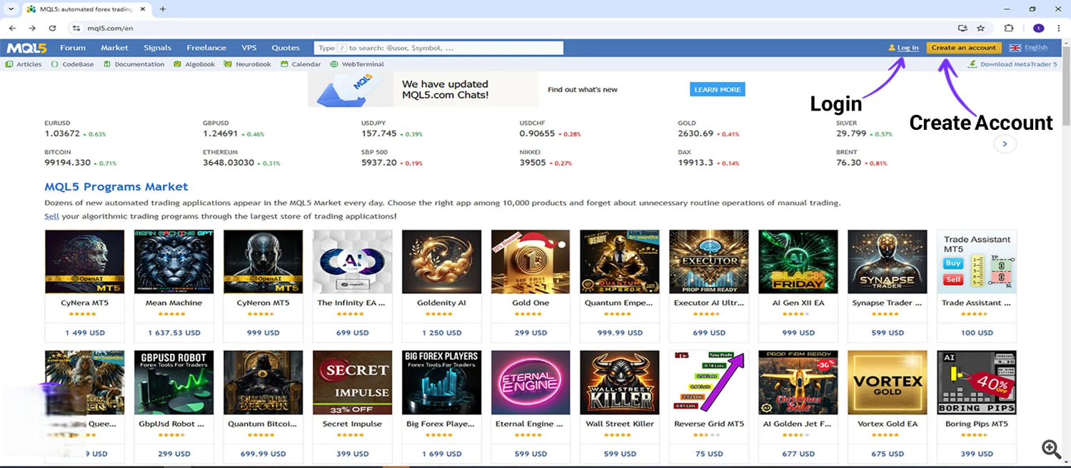 To begin, you need to access the MQL5 website. If you do not already have an account, you will need to create one. On the MQL5 website, select the “Create an Account” option. If you already have an account, simply click on the “Log in” button to activate it.