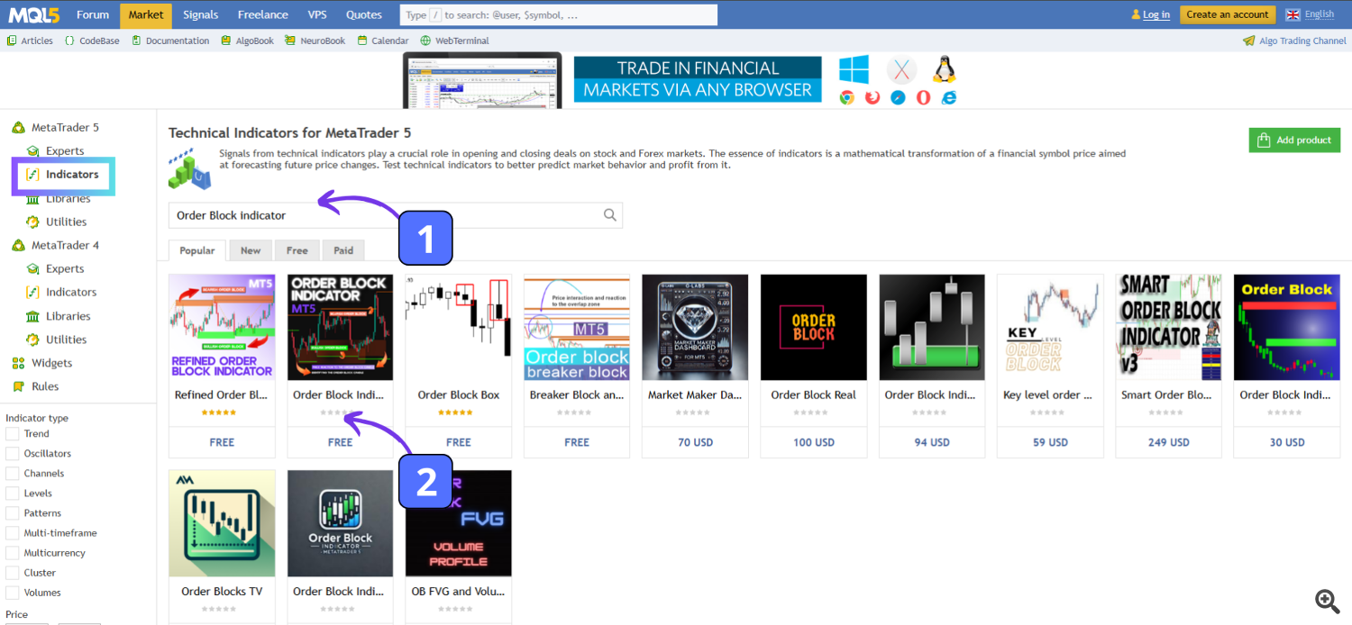 Method 1: Downloading Indicators for MetaTrader 5 from the MQL5 Website