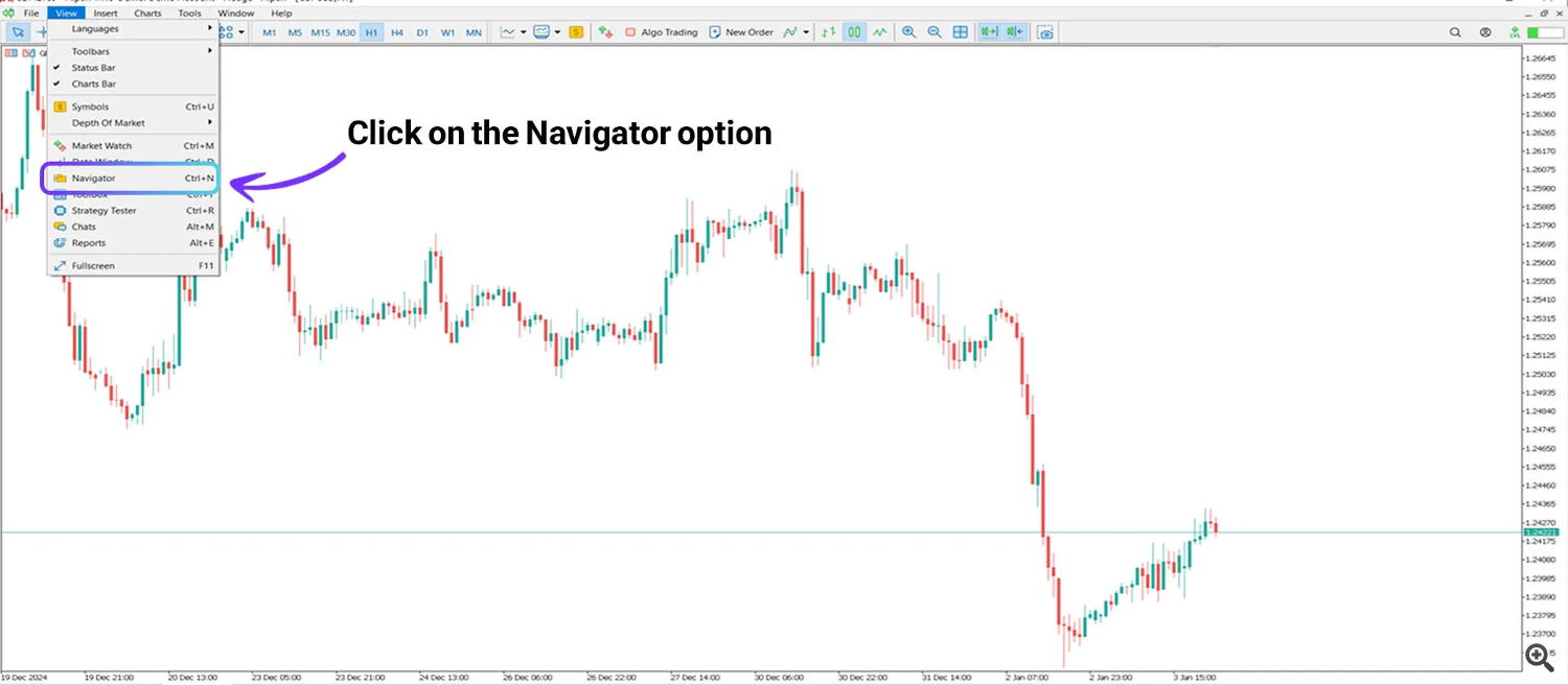 3. Go to the “View” menu and select “Navigator” to open the Market window.