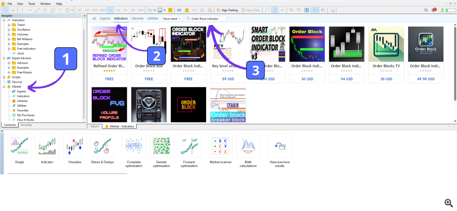 The MetaTrader 5 platform also allows you to download indicators directly from its built-in Market section. Here’s how: