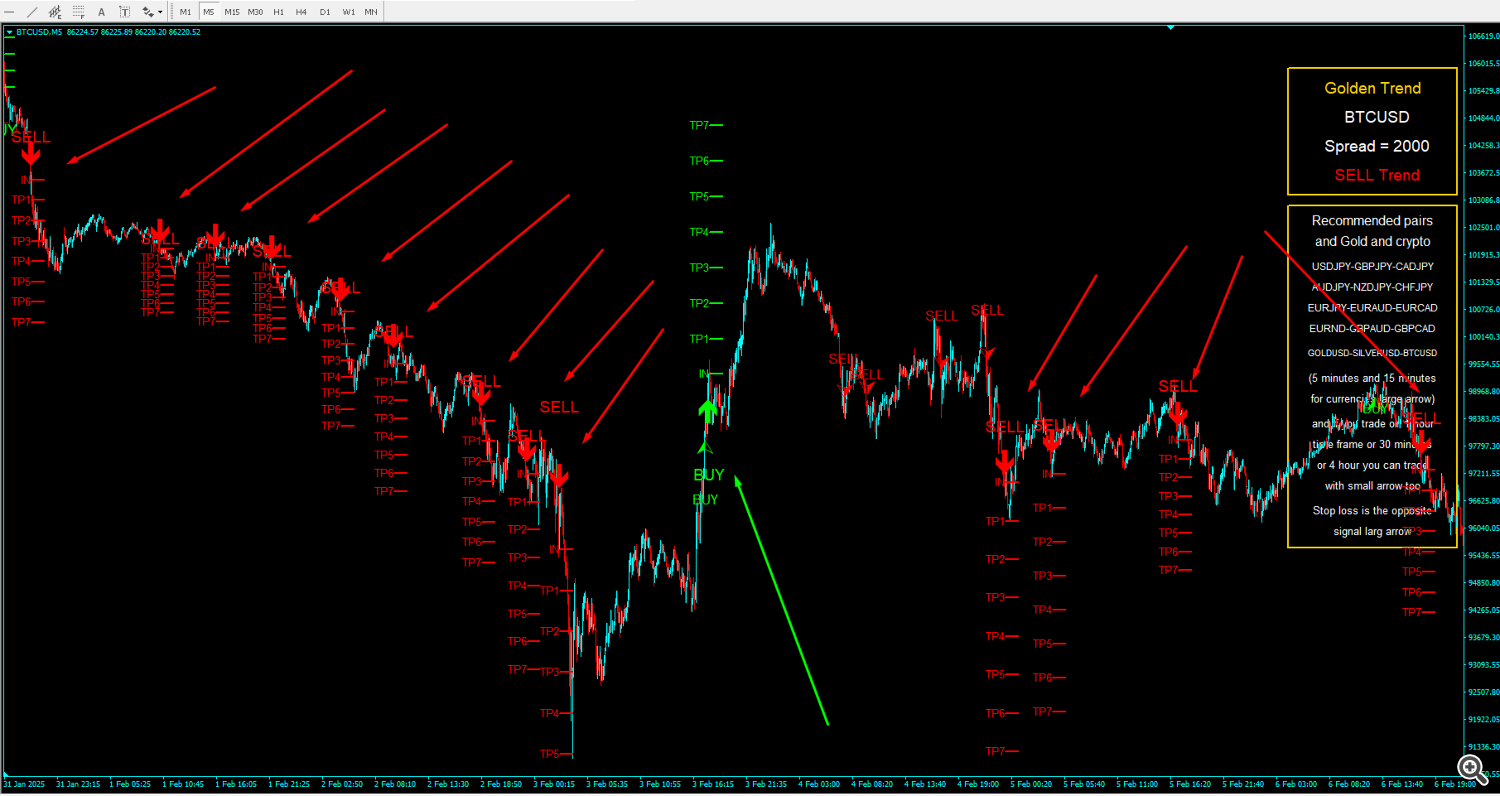 Golden Trend Indicator on bitcoin 5 minute time frame February and March performance
