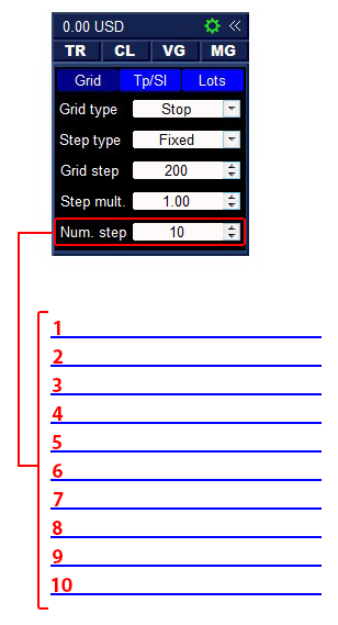- Lot start — lot size for the first order in the grid (0 – off).