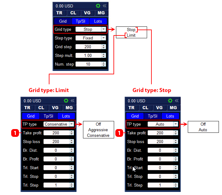 - Take profit type — the type of take profit calculation (Aggressive or Conservative, used only for the Limit grid type).