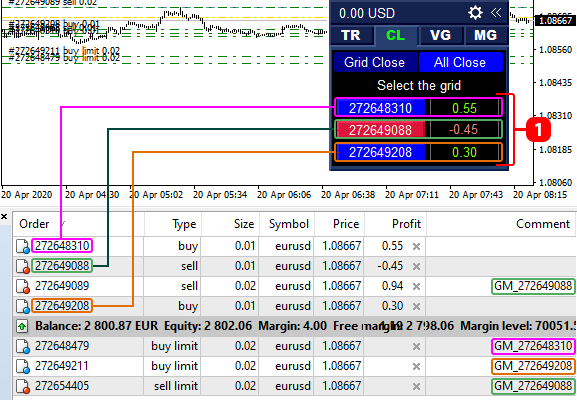 The application can manage up to 20 order grids. To sort them, each grid has its own number, corresponding to the master-order ticket. Each grid order, with the exception of the master-order, has a comment with the number of the grid to which it belongs. To close the order grid, click the button with the corresponding grid number.