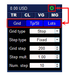 Take profit and stop loss settings for the order grid. Trailing stop and Breakeven function settings.