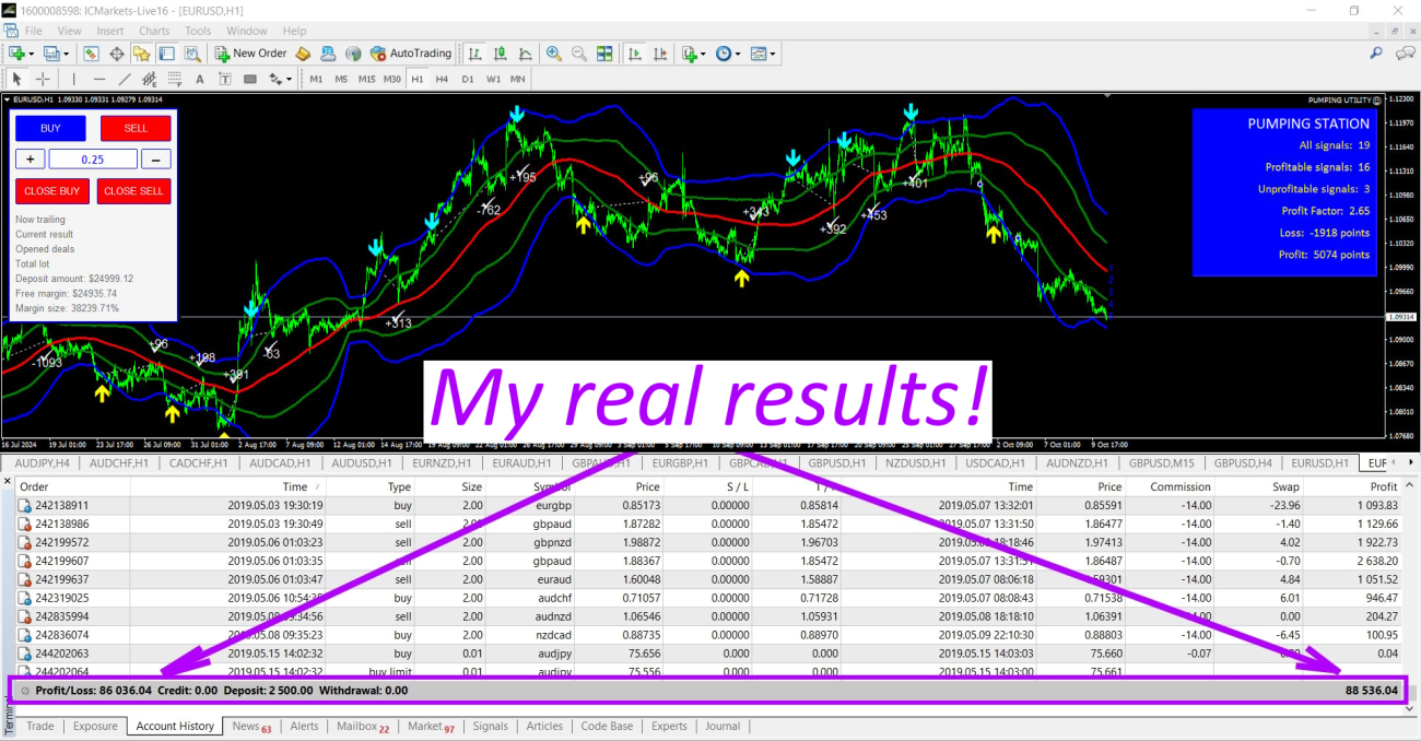 I named this strategy “Pumping Station” because it allows anyone – even a beginner trader – to start “pumping” money from the Forex market. A few years ago, after creating this strategy, I managed to grow my trading account from $2,500 to $88,000 in just 9 months (that’s about 3,500% growth). Admittedly, this was extremely high-risk trading, and I wouldn’t advise anyone to trade that aggressively.