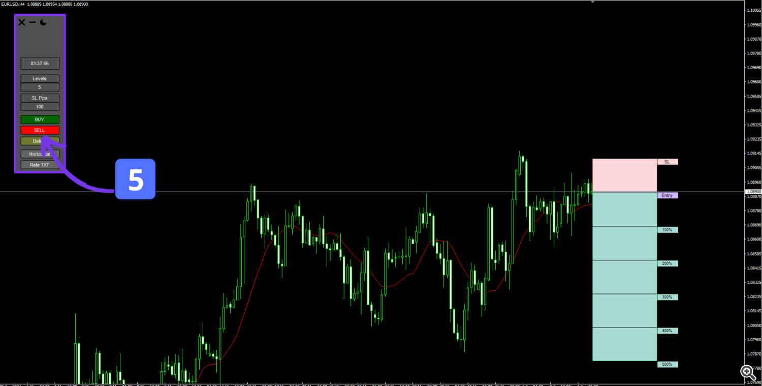 5- By clicking the Sell button in the Risk Reward Ratio Calculator Indicator, a descending Risk to Reward (R/R) structure is generated on the chart. This structure visually displays the predefined Take Profit (TP) levels and the Stop Loss (SL) level, with each target clearly marked. The indicator automatically calculates the R/R ratio based on the entered SL and TP values, providing a clear and organized representation of the trade’s potential outcomes. This feature allows traders to quickly assess the risk-reward profile of a sell trade before execution, ensuring alignment with their trading strategy and risk management rules.