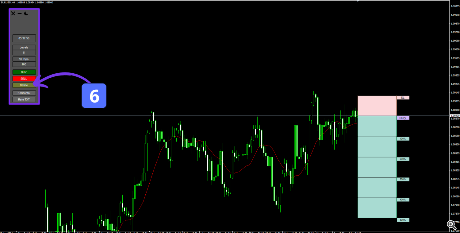 6- By using the Delete button in the Risk Reward Ratio Calculator Indicator, all elements of the Risk to Reward (R/R) structure, including the Take Profit (TP) levels and Stop Loss (SL) level, are removed from the chart. This feature allows traders to quickly clear the visual representation of the R/R setup, ensuring a clean workspace for analyzing new trade opportunities or adjusting existing strategies. The Delete function is particularly useful for resetting the chart without manually removing individual elements, saving time and improving efficiency in trade management.