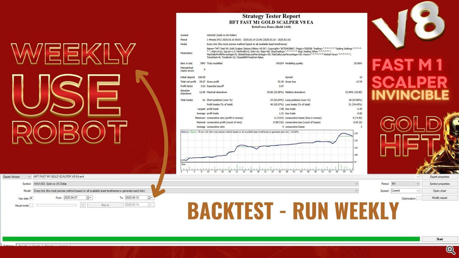 You can backtest it as long as itās done on a WEEKLY basis. Because the proposed strategy for this EA is to risk the same capital repeatedly and withdraw profits each Friday (to keep potential losses under control), you must avoid greed and follow the guidelines. This EA involves risk, so itās not advisable to allocate more capital than youāre willing to lose. After all, losing 10ā15 USD is one thing (on a 100 USD capital), but losing what you earned the previous week doubles the lossādo you see the point? Of course, a monthly backtest might show higher profits (because it drags over previous days/weeksā gains), but DD will skyrocket as well as the associated risk and potential losses. PLEASE FOLLOW THE RECOMMENDATIONS.