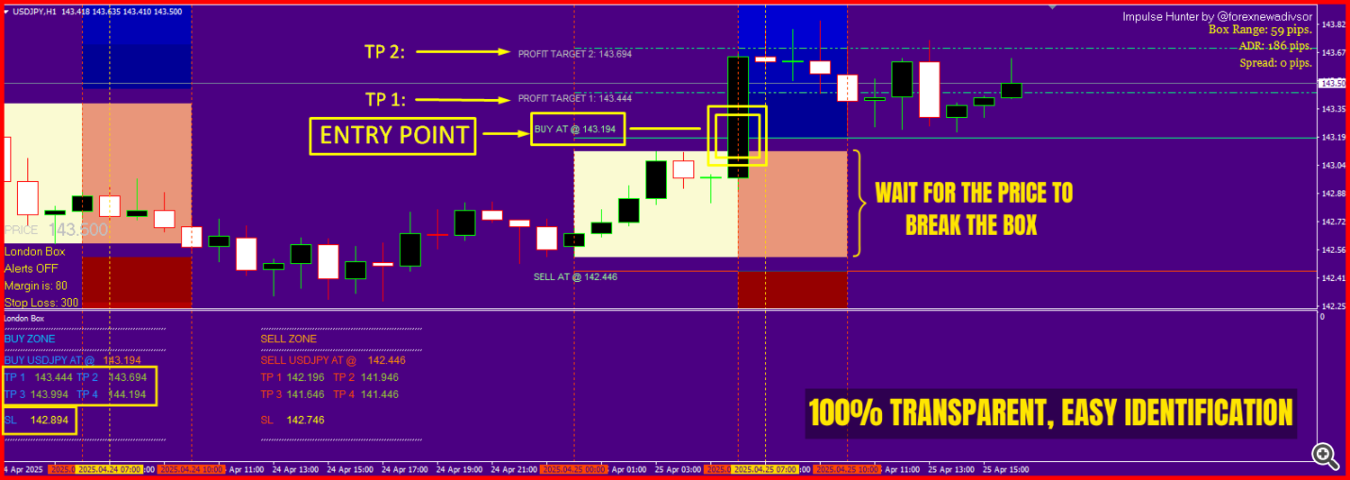 Impulse Hunter is a dynamic trading indicator that monitors price movements during the most active global sessions โ Asia, London, and New York โ and highlights moments where momentum breaks through key levels. Instead of relying on guesswork, traders are provided with a clear visual structure: session-based breakout zones, layered take-profit targets, and adaptive stop-loss levels tailored for each currency pair.