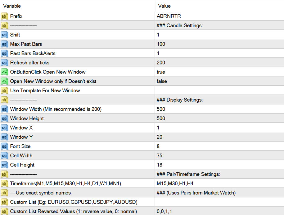 You can specify your own custom pairs list. Make sure that pair name is exactly like in market watch. And pair is available in Market watch. If Custom pair list is blank, it will use all pairs available in Market watch.