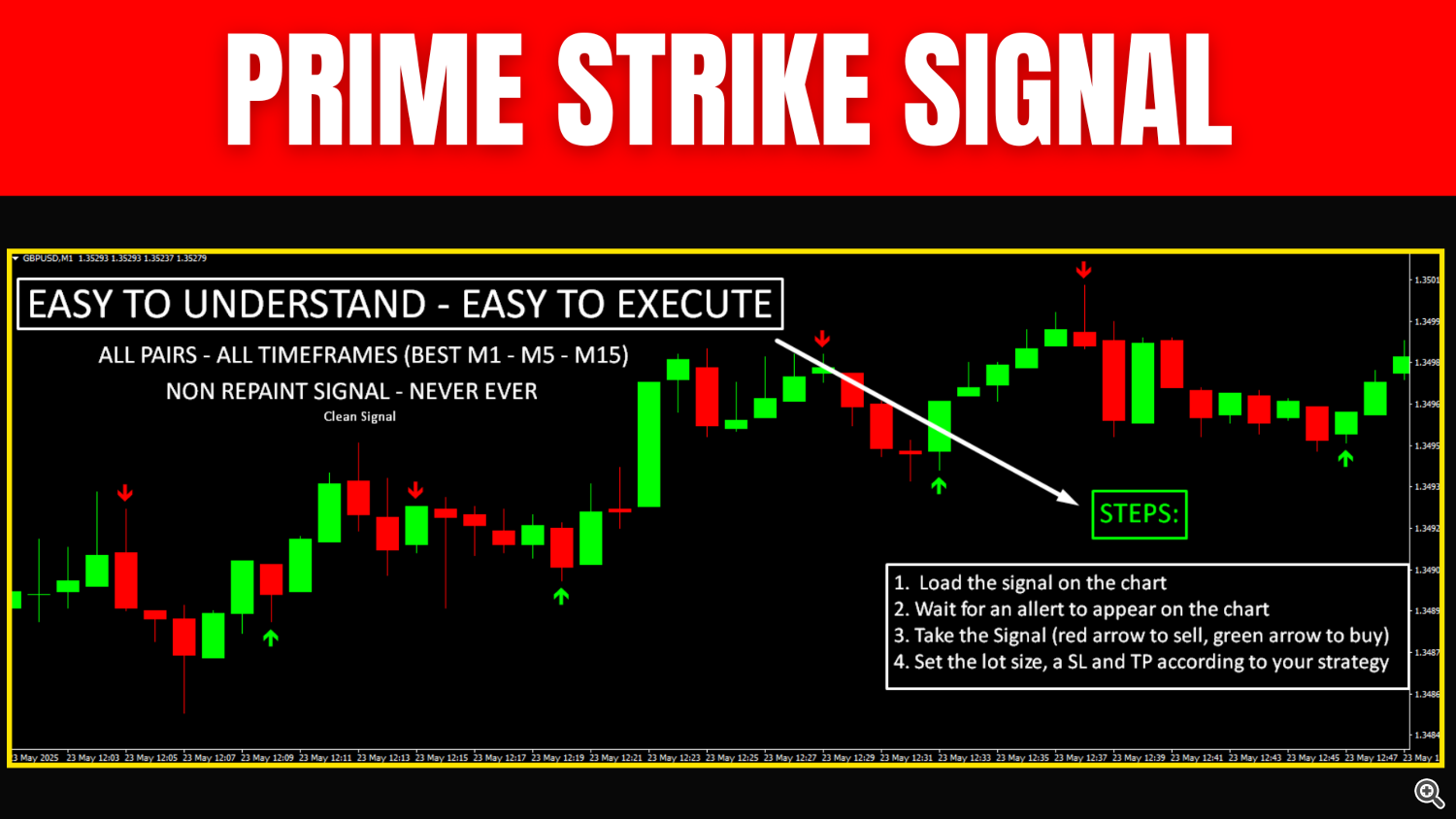 Prime Strike Signal No Repaint Never is a clean, rule-based signal tool designed for traders who demand visual clarity and consistency in volatile market conditions. It identifies directional shifts with immediate on-chart arrows, helping you stay aligned with short-term price movement without overcomplicating your chart.