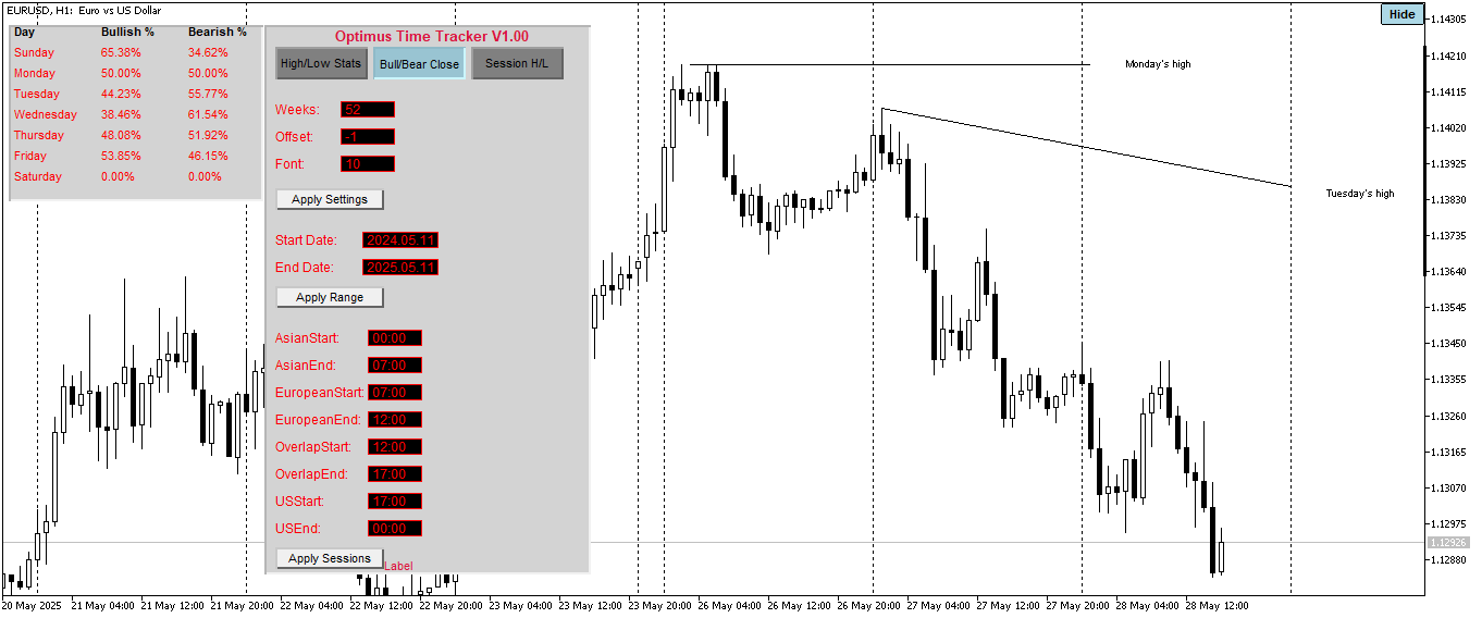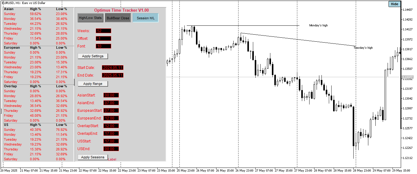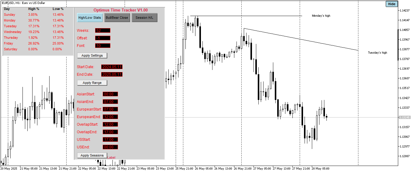 In the Weekly High and Low Stats we could see that Monday had the highest frequency for making the high of the week, this first of all suggests to us that about 30% of the weeks within the look back period had bearish expansions that ensued from monday, the first trading day of the week. Having this in mind plus the current bearish structure, it is not inprobable for us to anticipate that Tuesday will deliver to the downside. Now if Monday is apt to make the high of the week and Tuesday is more likely to close as a bearish bar, we are then inclined to hunt for an opportunity to take a short position on Tuesday. This is where the next mode of the Optimus Time Tracker Indicator Comes in Handy, “The High and Low of the Day By Session Mode”.