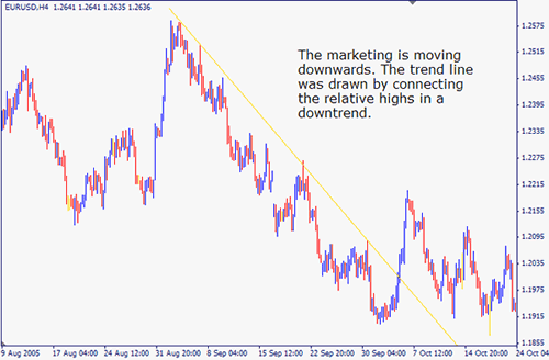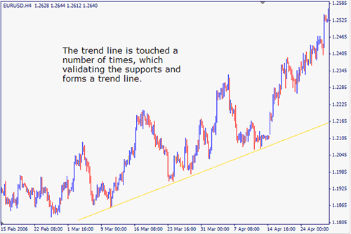 Drawing trend lines is a highly subjective matter. The best test of whether a trend line is a valid one is usually whether it looks like a good line. In an up trend, a trend line should connect the relative low points on the chart. A line connecting the lows in a longer-term rally will be a support line that can provide a floor for partial retracements. The down trend line that connects the relative highs on the chart will similarly act as resistance to shorter moves back higher.
