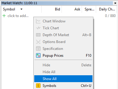 Right-click anywhere in the Market Watch window and select “Show All”.