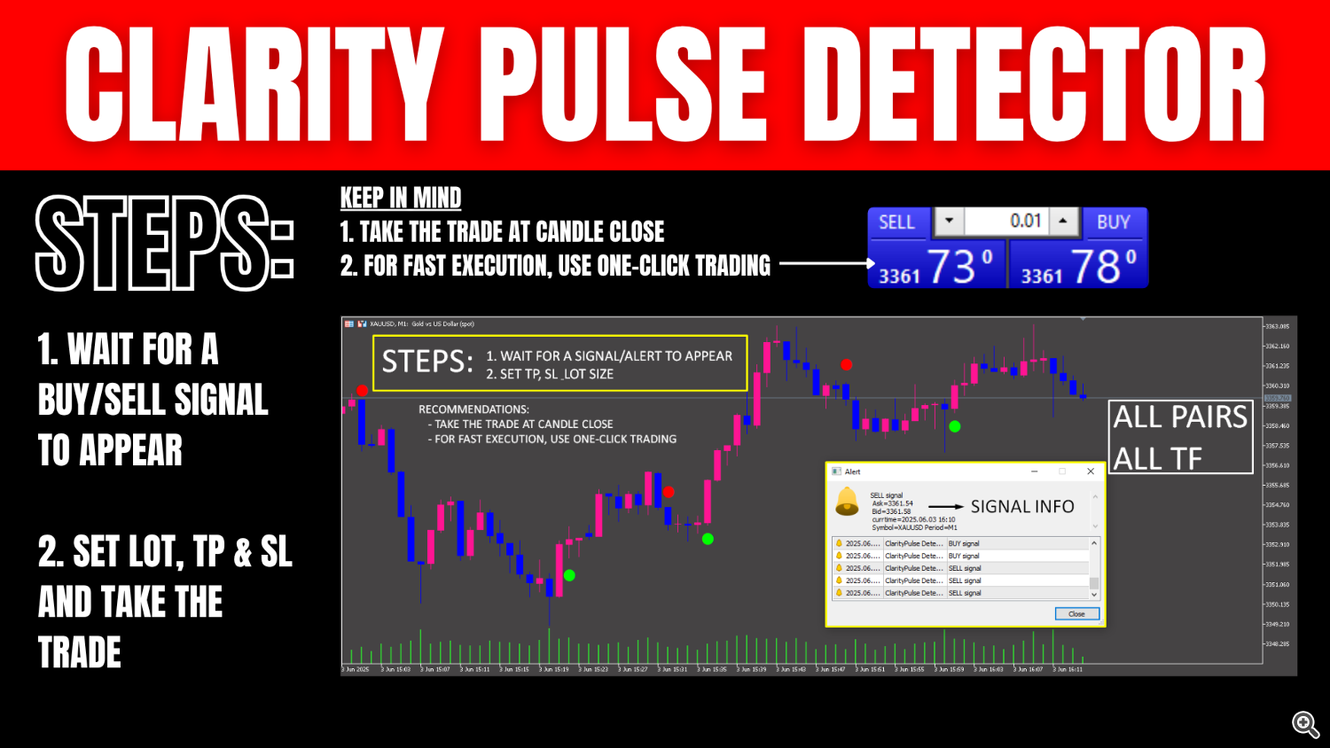 - Step 1: Attach Clarity Pulse Detector to any chart and wait for a buy or sell marker at candle close.