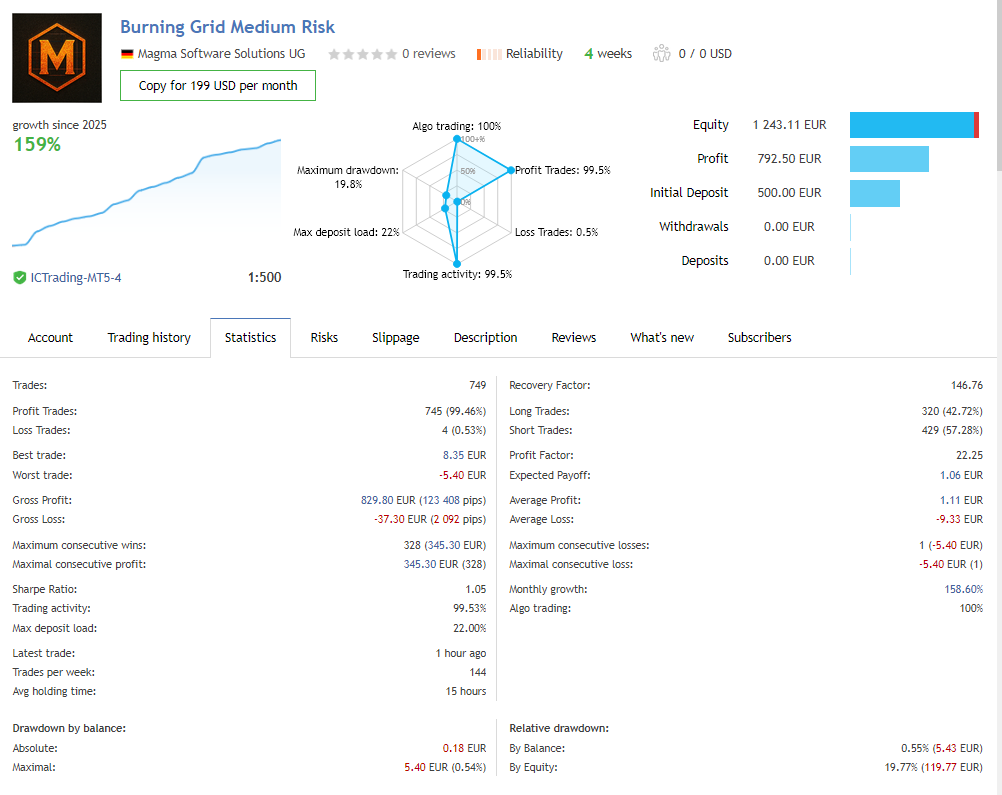 On May 9, 2025, my three new MetaTrader trading signals officially launched: Burning Grid Low, Medium, and High Risk. Each is powered by my Expert Advisor, Burning Grid, a structured grid trading system designed to combine performance with strict risk management.