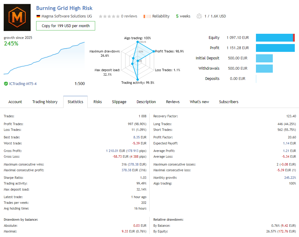 Burning Grid proves that grid trading doesn’t have to be chaotic or destructive. With the right constraints, logic, and automation, it becomes a scalable, controlled and profitable strategy.