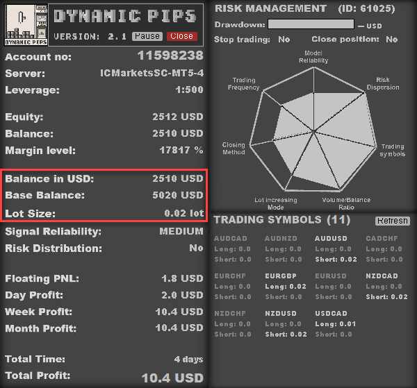 Figure 2: Dynamic Pips EA – Balance and Trade Volume Information on the Dashboard