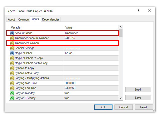- Prefix of the Transmitter Account: 如果发送方账户在所有常用工具/货币对前面有一个非点前缀,您应该将其放在这里,以便将交易复制到不使用该前缀的其他经纪商,没有任何问题。 例如,如果您的经纪商有一个 mEURUSD 符号,您应该在此字段中输入 m。 此设置应仅在接收方账户中填写。 如果发送者账户在每个符号前有一个点前缀,它将被自动映射和复制,无需任何特殊设置。 自动发送器前缀映射仅适用于主符号前带点的前缀,如 r.EURUSD,不适用于 ecnEURUSD 或 +EURUSD 等前缀。