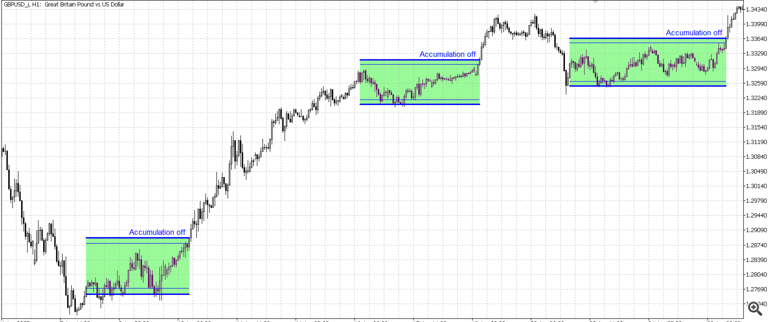 As soon as the indicator shows the label “Accumulation off” on the current accumulation, it means that the current accumulation is over.