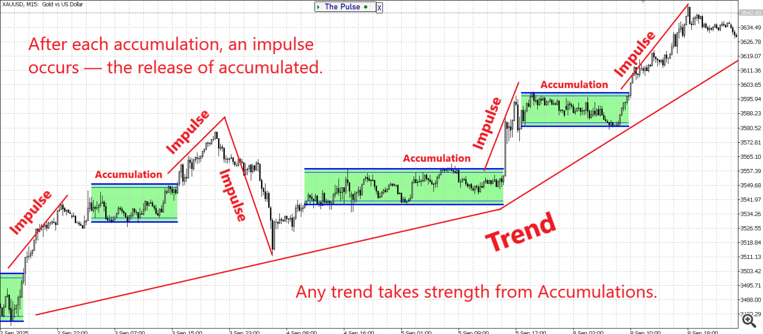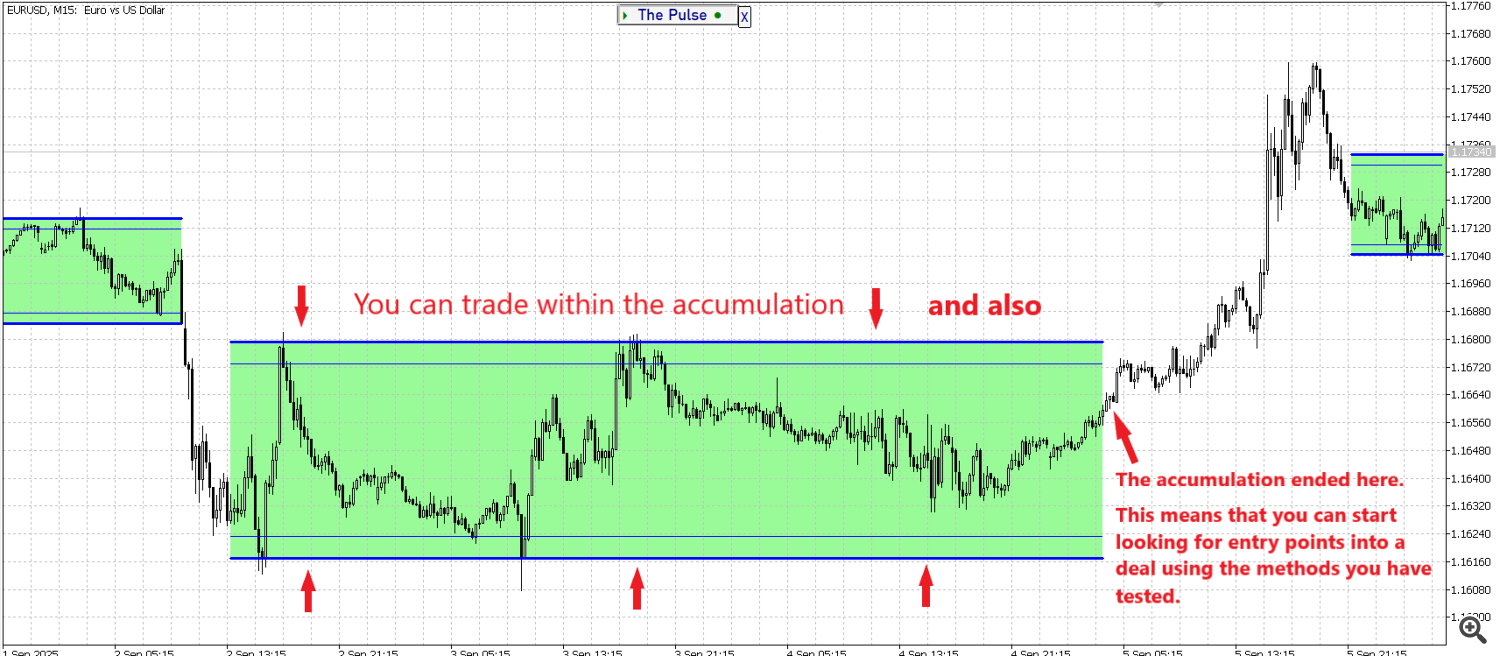 For example: the trend indicator shows that a trend has started, and The Pulse indicator shows that the current accumulation is still active, so it may be necessary to delay entering trades until the accumulation ends and The Pulse signals the end of the current accumulation. This way there will be fewer risky and unprofitable trades.