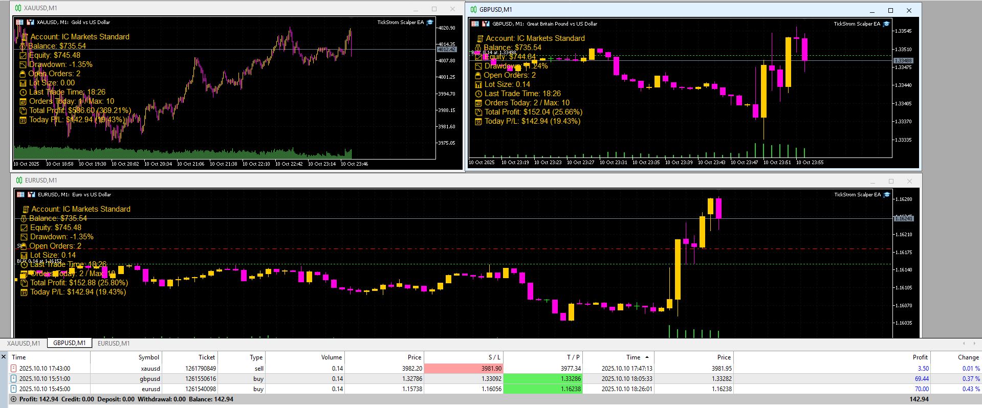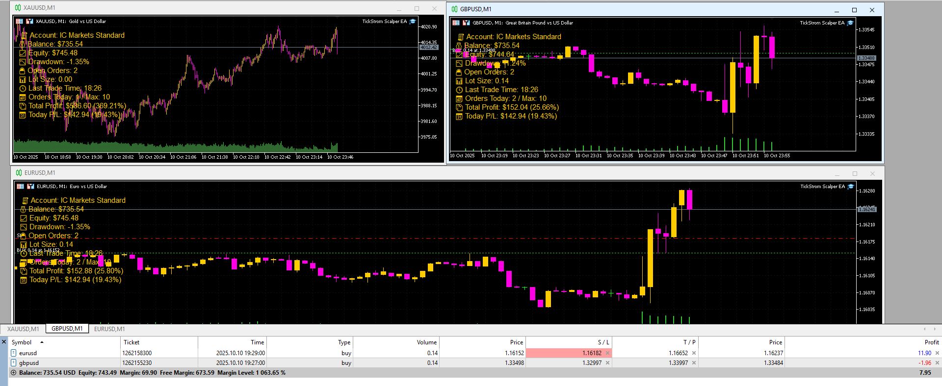 On a single account, by attaching TickStorm to multiple charts (XAUUSD, GBPUSD, EURUSD) — all using the M1 timeframe