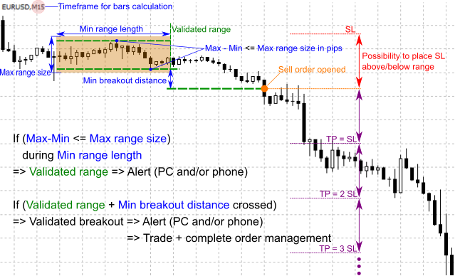 First of all, this EA alerts (if option checked) when a symbol enters into a range phase. Then, it will wait for breakout of the range (with additional filters if needed) to send an alert and/or to open an order. The main advantage of this EA is that it allows you to customize the specifications of your range.