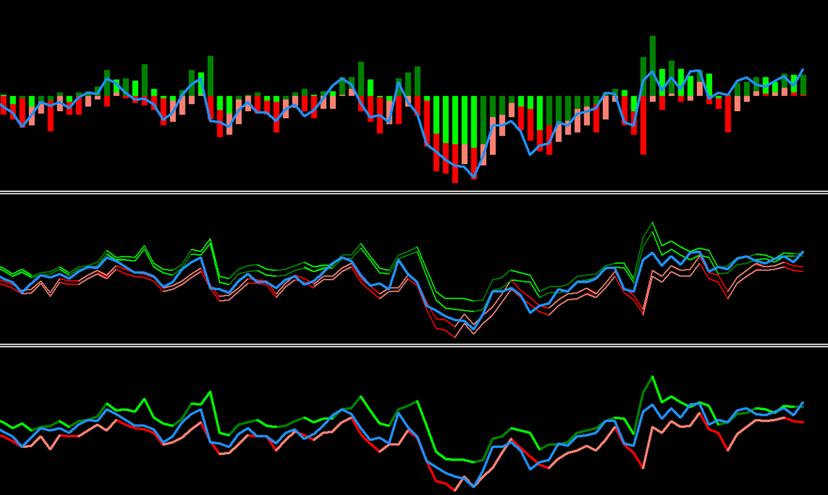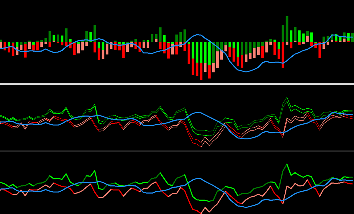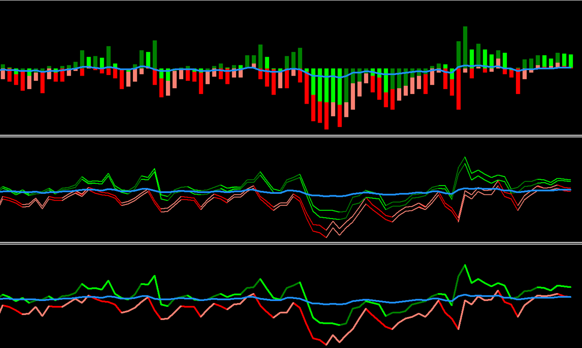 What it shows: A blue line that goes positive when bulls are pushing up, negative when bears are pushing down. The line itself indicates momentum direction without requiring the main Bull/Bear Power lines.