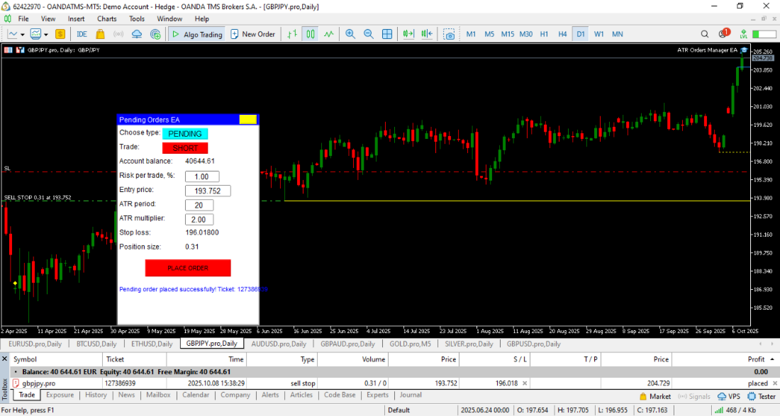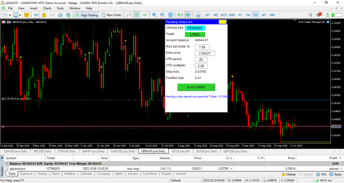 You can place risk-controlled market orders or pending orders (Buy Stop/Sell Stop) with dynamic stop losses based on Average True Range (ATR).
