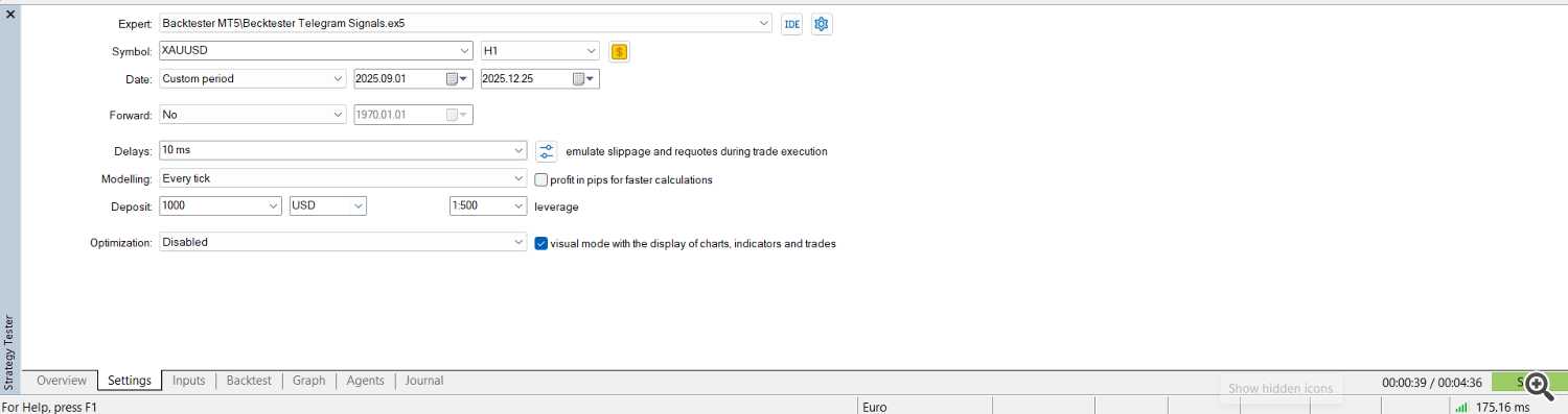 - Open the Strategy Tester in MT4 or MT5, attach the EA, and point it to the signals file.
