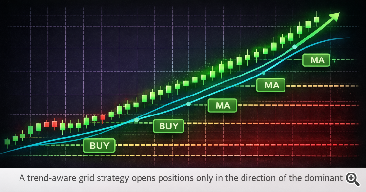 Rather than opening both buy and sell grids at the same time, a trend-aware grid system: