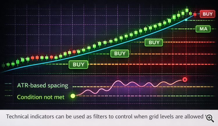 Grid spacing alone is not enough. Smart grid systems use indicators as entry filters, not signals.
