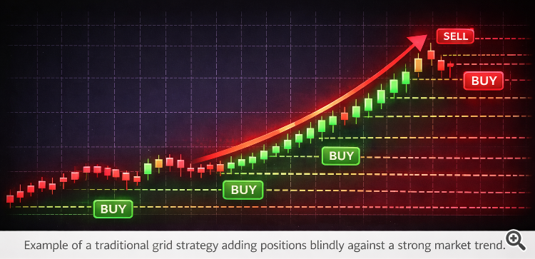 However, the biggest weakness of traditional grid systems is also their defining feature: they open trades blindly, without understanding market structure, trend direction, or momentum.