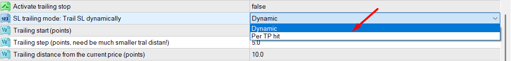 In PerTPHit mode, the dynamic parameters (Trailing start / Trailing step / Trailing distance) are not used for SL calculation (SL is moved to fixed levels: entry or previous TP).